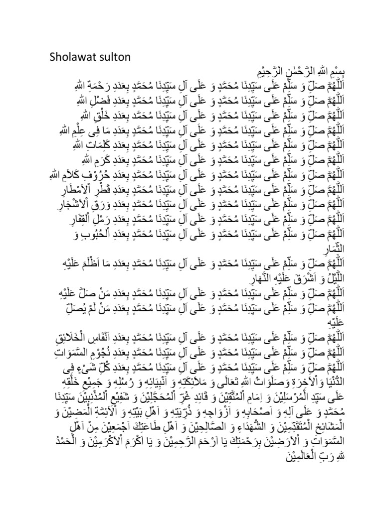 Ya Allah limpahkanlah rahmat dan salam kepada junjungan kami Nabi Muhammad SAW dan kepada keluarganya junjungan kami Nabi Muhammad SAW dengan sebanyak jumlah huruf dalam kalam Allah (kitab-kitab Allah).