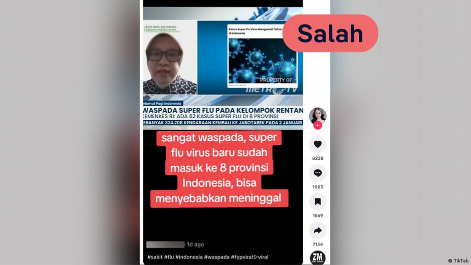 Sebuah unggahan di TikTok menuliskan, “Sangat waspada, super flu virus baru sudah masuk ke 8 provinsi Indonesia, bisa menyebabkan meninggal.”