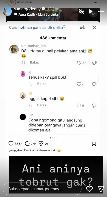 Dalam komentar tersebut tertulis, “DS ketemu di Bali pelukan sama ani-ani.”