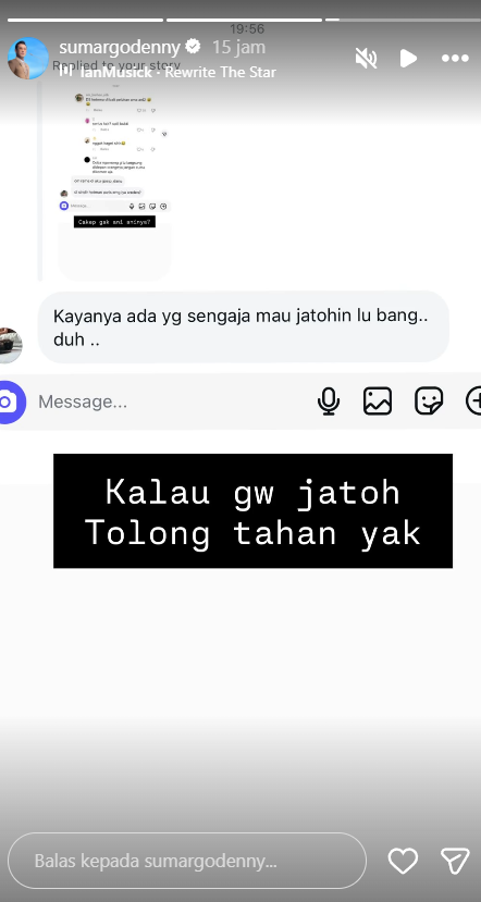 Pada unggahan story berikutnya, Denny Sumargo yang kerap disapa Densu turut merespons pesan warganet yang menduga ada pihak tertentu berupaya menjatuhkan dirinya.