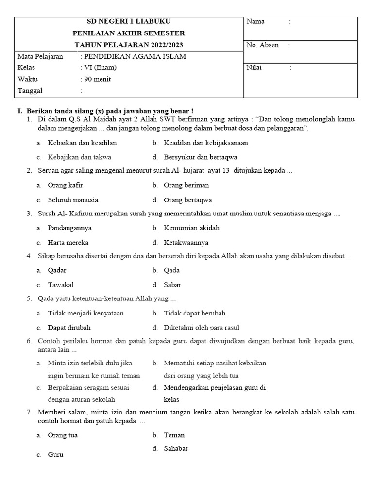 - Latihan soal BAB 6 PAI kelas 6 SD ini membahas materi mengaji Al-Qur’an Surah Al-A‘la melalui soal pilihan ganda dan esai lengkap dengan kunci jawaban.