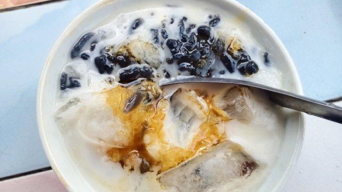 Disajikan dengan santan, gula jawa cair, serta tambahan es batu.