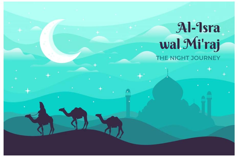 Isra (perjalanan dari Masjidil Haram di Mekah ke Masjidil Aqsa di Yerusalem) dan Mi’raj (perjalanan dari Masjidil Aqsa naik ke langit hingga Sidratul Muntaha untuk menerima perintah salat lima waktu langsung dari Allah SWT).